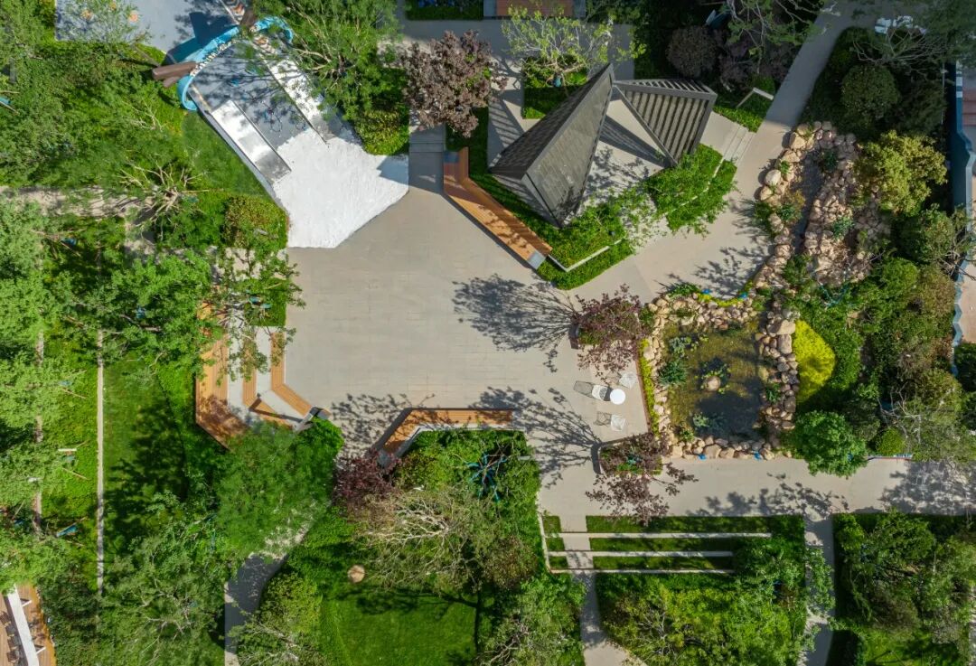 场地原有1.5米高差,设计因借和放大这一特征,在低处进行局部下凹,在高处设置挑台,创造出2.7米的独特高差体验。地形的起伏强化了场地的空间感,方寸之间见飞鸿,别有洞天。为强化这一设计意象,设计进一步将其打造为“城市生活中的立体丛林”,通过林木种植和景观设施,构成台地式林荫下沉广场和阶梯剧场,为全年龄社区居民提供丰富的休憩场所和观景体验。