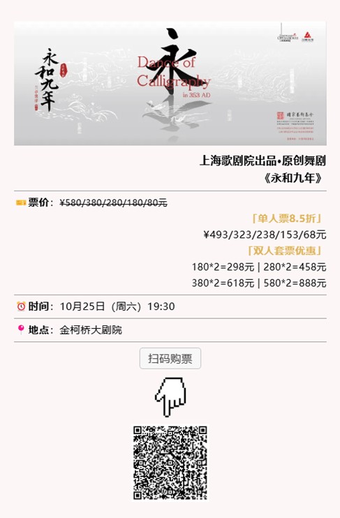 目前,舞剧《永和九年》已开通票务预售通道。一场关于书法、美学与生命哲学的极致盛宴,一次与先贤跨越千年的灵魂对话,即将在绍兴隆重启幕。准备好,迎接这场期待了1600多年的重逢吧!