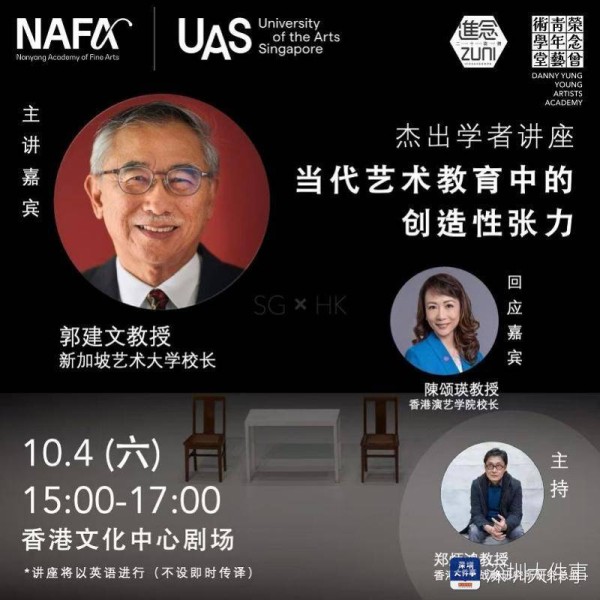 下午3时,一场题为“当代艺术教育中的创造性张力”的杰出学者讲座将举行。新加坡艺术大学校长郭建文将率先进行专题演讲,香港演艺学院校长陈颂瑛随后根据内容展开对谈。通过对两地当代艺术教育的观察与解读,深入探讨当前艺术教育的核心议题,揭示其中的创造性艺术普及教育的重要性。年轻一代需为从知识经济迈向概念经济的转型做好准备。此新篇章的使命,在于通过与本地及国际艺术社群和业界伙伴合作,培育具前瞻视野的新一代艺术家、设计师、教育家、研究者、艺术领袖与变革者,为文化景观与创意经济注入活力。讲座将以英语进行,并设有问答环节。