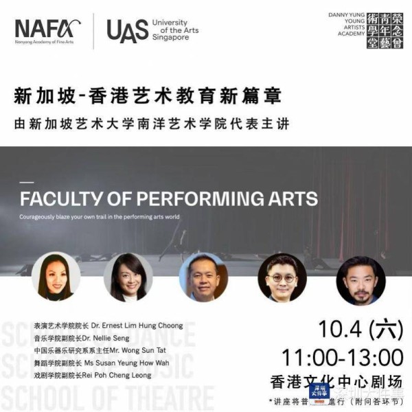 首场讲座将于上午11时开始。届时,来自新加坡艺术大学南洋艺术学院多位代表将亲临现场,带来“新加坡香港艺术教育新篇章”的讲座。包括表演艺术学院院长林汉崇,音乐学院副院长程秀蓉、中国器乐研究系系主任黄晨达等。讲座将聚焦教育模式的创新与碰撞,探讨如何开创表演艺术教育新路径,推动跨文化交流及创作。该场讲座将以普通话进行。