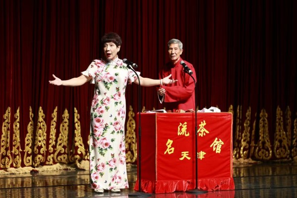 10月2日晚,名流茶馆相声团演员刘春慧(左)和庞军在天津中华剧院进行表演。新华社记者 周润健 摄