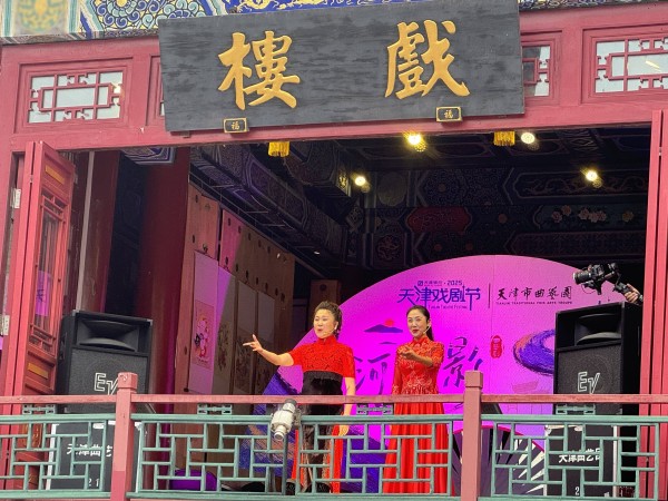 10月1日,天津市曲艺团两位演员在古文化街戏楼表演曲艺剧《海河故影》。新华社发