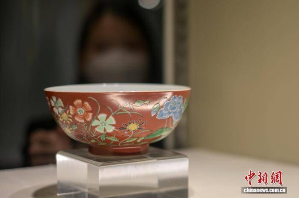 图为清雍正的洋彩珊瑚红地花卉纹碗。中新网记者 陈永诺 摄