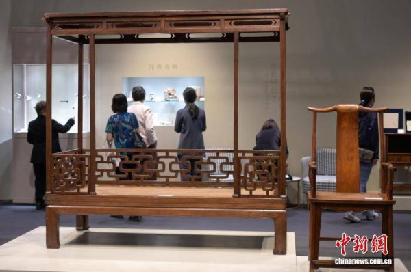 图为明末清初的黄花梨子母屜六柱小架子床(左)。中新网记者 陈永诺 摄