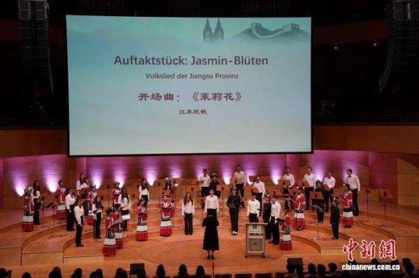 当地时间10月4日,中德青少年交流音乐会暨“唱歌学中文”夏令营汇报演出在德国埃森举行。图为中德青少年合唱开场曲《茉莉花》。 中新社记者 马秀秀 摄