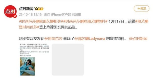 时尚芭莎删除那艺娜物料,网友称其被“退货”