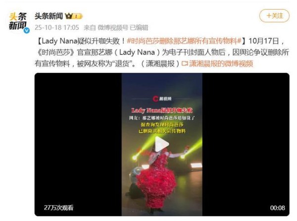 10月17日,时尚圈上演了一场“24小时极限反转剧”——《时尚芭莎》高调官宣那艺娜(Lady Nana)成为电子刊封面人物,话题 #那艺娜登时尚芭莎# 刚冲上热搜,短短一天内,所有宣传物料竟被全面删除,微博、电子刊预告消失得干干净净。这波操作被网友戏称为“时尚圈最快退货事件”,瞬间点燃舆论风暴。