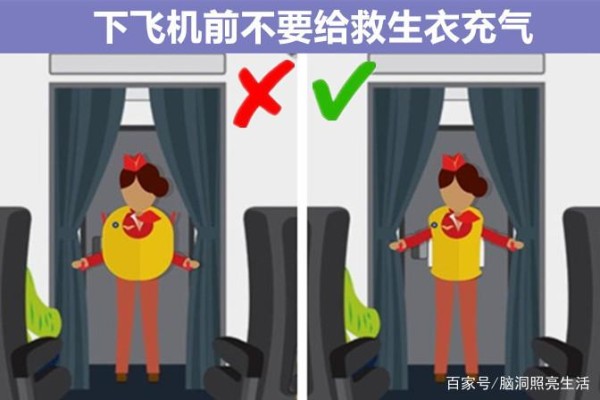 这是因为在快速淹没的飞机舱内,你的救生衣充气会使自己漂浮到机舱的最上方,这会导致无法正常移动,反而会把自己困在里面,这是特别危险的,正确的技巧则是,当你安全离开飞机时,才能拉动身上的充气绳。