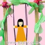 [环保手工]幼儿手工——荡秋千的小女孩日期:2011-04-27 12:03:44点击:22219在春光明媚的日子里,一个阳光女孩荡起秋千,体验飞一般的感觉。准备几张彩纸、一小块硬纸板、一个牙膏盒、几根筷子、一些皱纹纸和几根彩绳。...