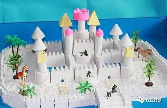 98%的沙子,2%的魔法。魔法就是一种高分子材料,使沙子之间有很强的吸附力,可以粘在一起,流动性强,不黏手,如同会呼吸一样。可以根据孩子的想象搭建、组合、塑造、雕刻出不同的造型。