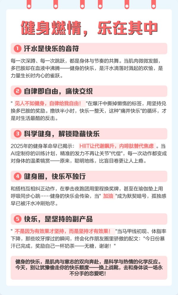 健身的快乐,是肌肉与意志的双向奔赴,是科学与热情的化学反应。今天,别让犹豫偷走你的快乐额度——换上战靴,去和身体谈一场永不分手的恋爱吧!