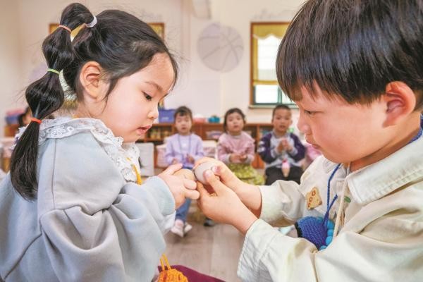 “捆立夏绳”“斗蛋”“称人”……昨天,海曙区月湖街道平桥社区志愿者走进宁波市市级机关第一幼儿园,为孩子们带来了一堂立夏传统习俗体验课。