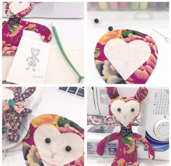 第六步:采用平缝工艺,将耳朵、手、腿等部件固定在预定位置,参照图示进行缝制,并留意各部件的方向性。