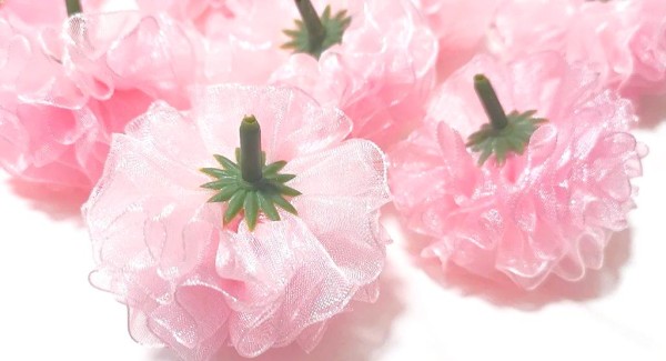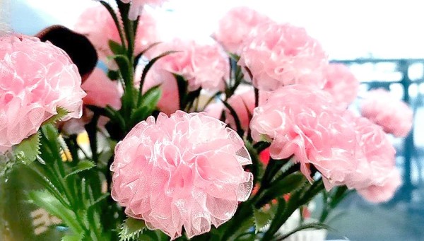 最后一步是将配送的花芯穿过花托,进行组装备用。至此,一朵朵栩栩如生的康乃馨便大功告成。