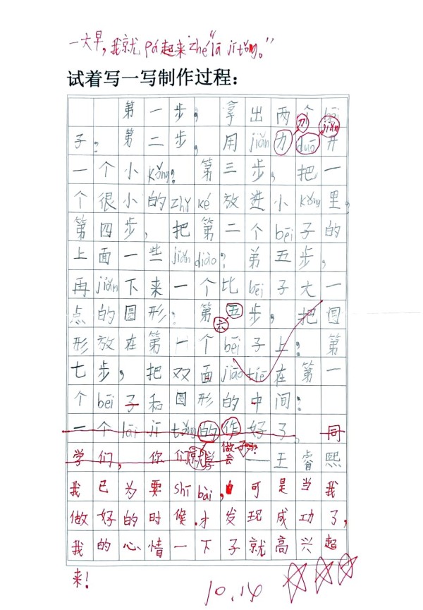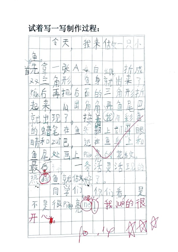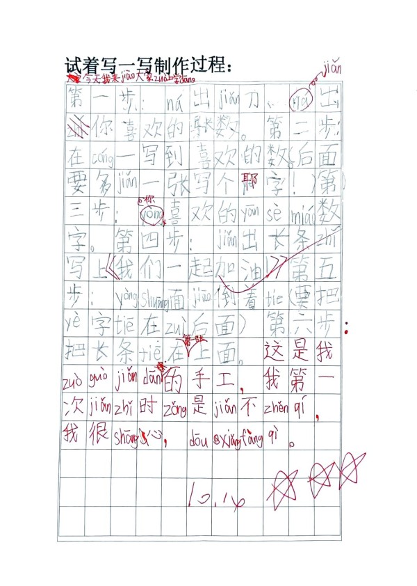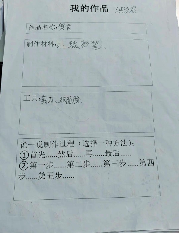 在周末闲暇时光,回家动手制作一件手工作品,随后填写一份记录单,详细描述制作过程。尝试用文字将制作过程进行叙述,尽量详细地描绘每一个步骤。在课堂上,先构思好文章的开头和结尾,再根据实际制作过程进行适当的修改和补充。