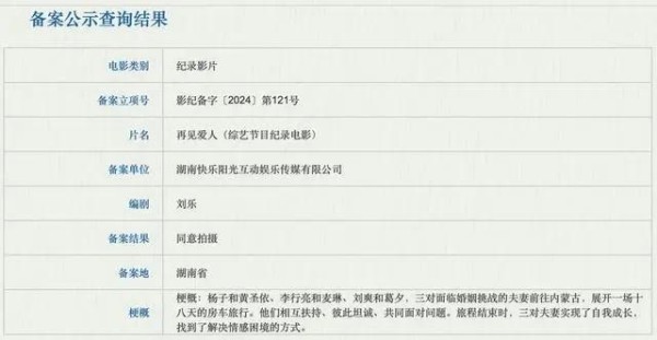 12月13日,国家电影局发布“关于2024年11月上全国电影剧本(梗概)备案、立项公示的通知”,通知显示《再见爱人》综艺节目纪录电影已经备案。