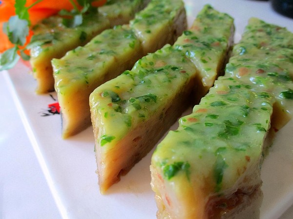 九层粿用米浆蒸熟而成的,因有九层而得名。加入肉末、葱花、香菇等食材,味道鲜美,口感软润富有弹性,吃起来有滋有味,十分诱人。
