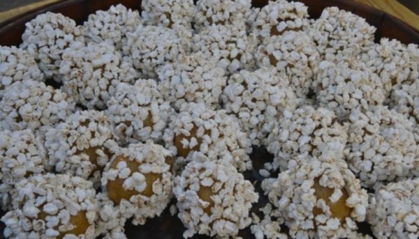 老虎蛋是畲族的一道特色小食,工序繁复,味道丰富。将地瓜和糯米粉揉在一起,包上花生米等馅料,涂上麦芽糖,然后裹上爆米花,一份香甜可口的老虎蛋就做好了,十分具有风味。