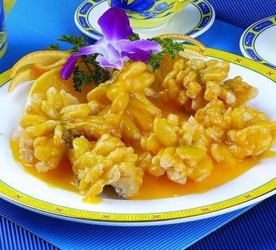 这道橙汁麻花鱼制作过程中,鱼需先腌后炸,形成金黄色麻花状。搭配橙汁酱汁,使得整道菜清新而可口。