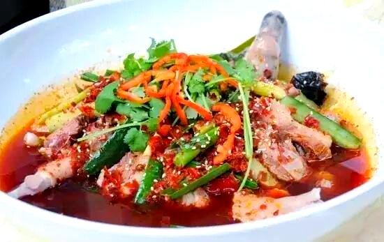将浸泡充分的荷折皮用姜丝翻炒至透,随后注入麻辣汤并烧沸。在调味后,撒入鲜嫩的芹菜段和辣椒丝,一道美味的西渡土头碗便大功告成。