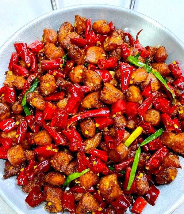 鸡胸肉切成小丁后,用盐和料酒腌制十分钟,再放入油锅中炸至金黄色,外酥里嫩。这样炸鸡丁香脆可口,加入花生后更具嚼劲与香味,是佐酒佳肴。接着,在锅中炒干辣椒,炒出香味后,倒入炸好的鸡丁。最后,加入花生仁,翻拌均匀后撒上一点椒盐粉。