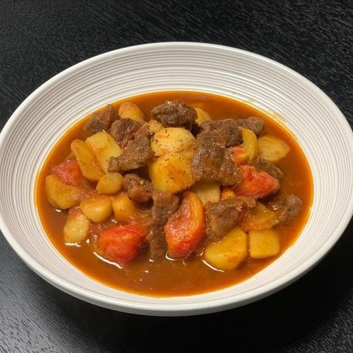 牛肉与土豆、胡萝卜等在高压锅中炖煮30分钟后,翻炒收汁,加入调味料。