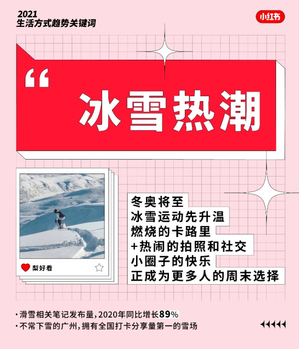 12月31日,小红书发布《2021生活方式趋势关键词》报告。报告显示,冰雪热潮、无糖主义、酒变甜、回血式独居、无性别穿搭、国潮澎湃、在家健身、治愈式旅行、外出露营、回家做饭等10个关键词成为2021年的生活方式趋势。