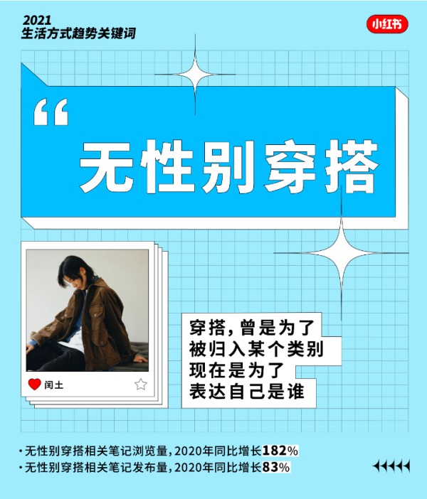 关于穿搭趋势,过去年轻人在追逐潮流的过程中是为了让自己找到同类,而如今穿搭成为他们的表达方式。2020年,无性别穿搭蔚然成风,相关笔记浏览量同比增长182%。
