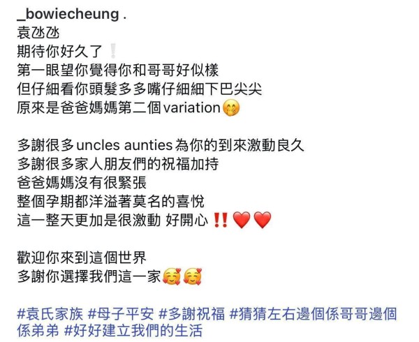 11月6日,袁伟豪妻子张宝儿在社交平台晒出温馨合照,正式宣布二胎宝宝平安降临。她深情写道:“欢迎你来到这个世界,多谢你选择我们这一家。”