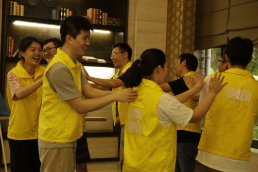 团队围成一个圈,左手手掌朝下,右手比一,培训师会讲一个小故事,关键词乌鸦,听到乌鸦一个手去抓别人的手,另外的一个手躲避旁边人的抓。被抓住的成员即被淘汰。