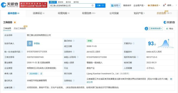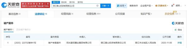 根据天眼查发布的商业风险信息显示,丽江雪山投资有限责任公司于11月6日新增破产审查案件,申请方为阳光壹百置业集团有限公司,目前已由丽江市古城区人民法院立案处理。