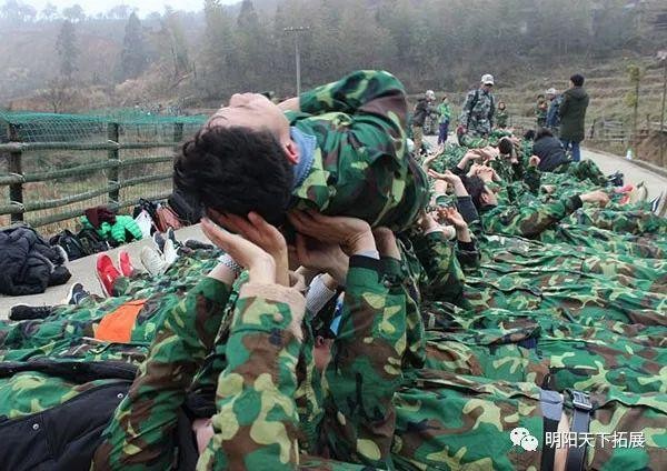 4、坐下后,培训师再给予指令,让学员叫出相应的口号:“例如“齐心协力、勇往直前。”