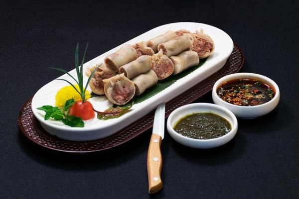 材料和制作:发子面肠是用新鲜的全羊制作的,经过多道工序洗净,然后加入葱白碎、生姜末、食盐、胡椒粉等调味料拌匀制作成肉馅,灌入肠内,蒸熟。