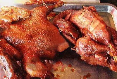 遵化特色美食,味道纯美、肉烂适口。它以味道纯美,色泽红润、肉烂适口,被群众所欢迎。他的烧鸡,将腿提起来,肉会自动脱落,吃完后,骨头剩不下一小把儿,肥嫩的小鸡,甚至连骨头都可一齐下肚。戴家烧鸡主要把功夫放在煮鸡上,煮时要精心,老鸡煮4个小时,新鸡2个多小时即可。煮鸡的佐料要全、花椒、大料、肉桂、丁香、白芷、三艾、葱、蒜、姜、酱油,缺一不可。