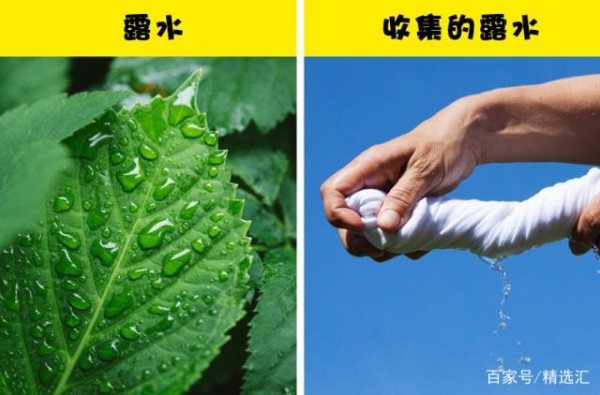 收集露水是获取饮用水的简单方法。用一块像你的T恤材质的布料(越干净越好),擦拭沾有露水的植物。然后把浸湿的织物拧到一个容器里,这样你就会得到一些水了。露水是可以安全饮用的,但对于收集露水的东西却未必,因此为了安全食用,最好能够对其消毒。