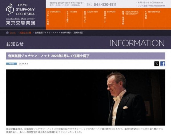4月5日,东京交响乐团宣布,其现任音乐总监德国指挥家乔纳森·诺特(Jonathan Nott) 将于2026年3月任期结束时不再续约,离任乐团,结束自己在乐团的12年总监任期。