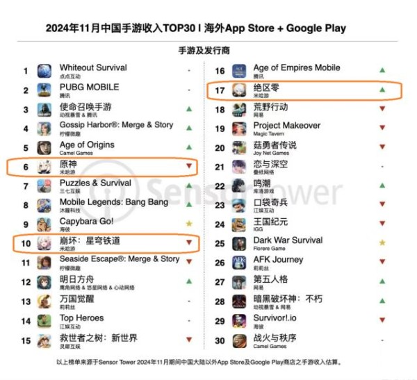 Sensor Tower的数据显示,2024年11月“中国手游收入TOP30|海外App Store+Google Play”,《绝区零》仅仅位列第十七位,落后于《原神》与《崩坏:星穹铁道》。