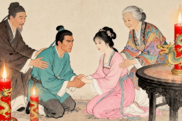 拜堂仪式顺利进行,苏文轩看着身边盖着红盖头的新娘,心里充满了幸福感。等到仪式结束,新娘被送入洞房,苏文轩应酬完宾客,才急匆匆地赶回洞房。他推开房门,看到新娘正坐在床边,红色的盖头垂在肩上,身姿窈窕,正是自己朝思暮想的人。