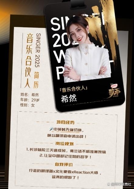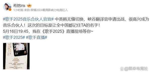 希然在微博中以“峡谷翻译官”为标签官宣加盟,暗示其将充分发挥中英韩三语能力,为节目中的国际歌手提供语言支持。结合《歌手2025》此前公布的“无界之声”主题及国际化阵容,希然极有可能与海外歌手搭档,负责沟通、采访及舞台互动环节。网友猜测,其专业能力或将弥补节目组在多语种服务上的短板,为国际歌手提供更顺畅的舞台体验。