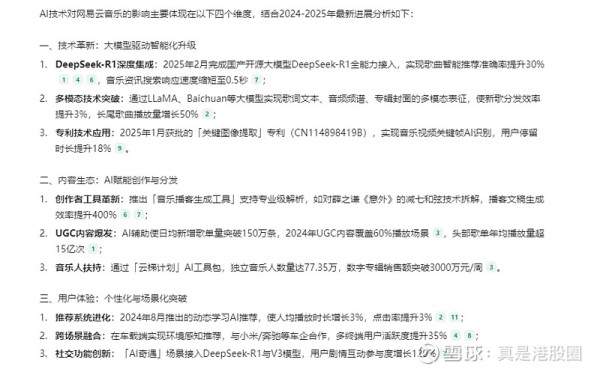 如果过去在线音乐平台只是一个听歌工具,那么在AI加持下可能重构整个生态,人人都是创作者人人都是听众,把蛋糕越做越大。目前网易云音乐已经完全接入deepseek-R1,从创作到分发到用户接受推荐,整个链条都更加高效。以下是让deepseek分析AI对网易云音乐的影响。