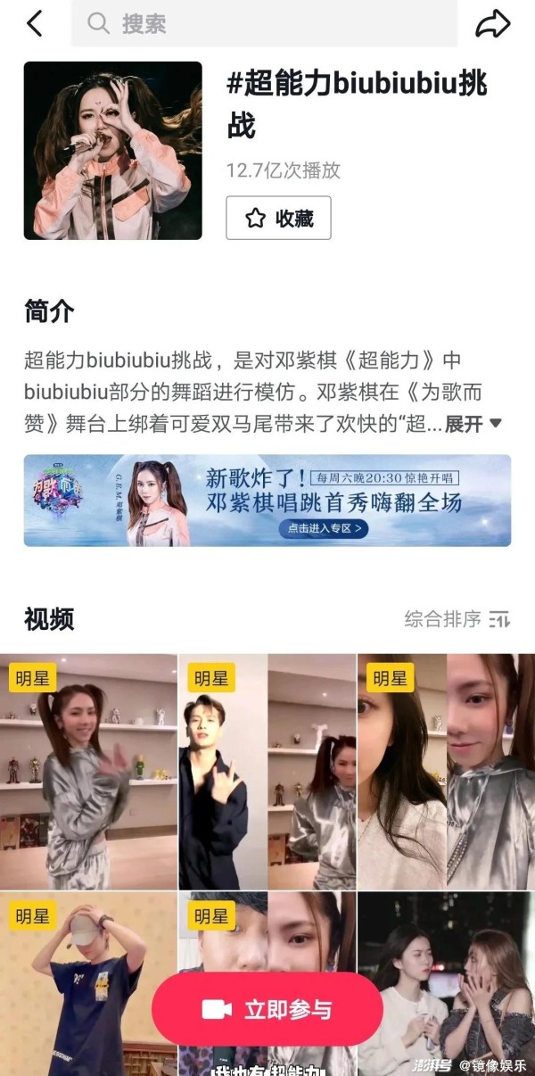和吴亦凡一样,越来越多明星开始在抖音打歌。前不久,长期活跃在打卡短视频特效一线的邓紫棋,在抖音发布全新单曲《超能力》。歌曲上线后,邓紫棋发起#超能力biubiubiu挑战 吸引鹿晗、陈赫、林俊杰、张柏芝等30多位艺人,以及诸多站内达人在线PK。