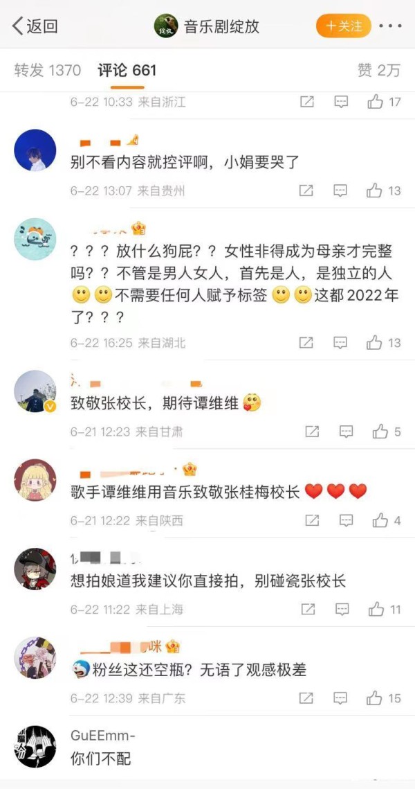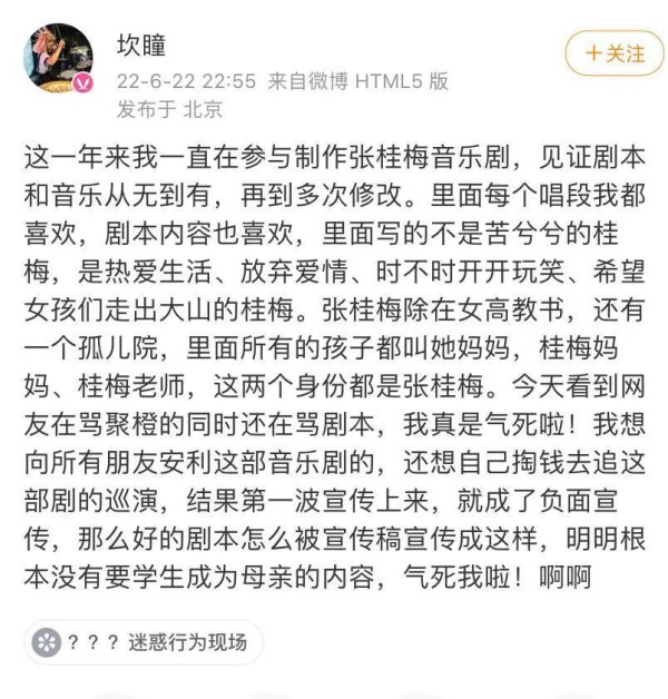 音乐剧编剧发文回应网友们的争议,自己一年来参与音乐剧的创作,见证剧本和音乐从无到有,多次修改。里面每个唱段都喜欢,剧本内容也喜欢,里面写的不是苦兮兮的桂梅,是热爱生活、放弃爱情、时不时开开玩笑、希望女孩们走出大山的桂梅。张桂梅除在女高教书,还有一个孤儿院,里面所有的孩子都叫她妈妈,桂梅妈妈、桂梅老师,这两个身份都是张桂梅。看到网友在骂聚橙的同时还在骂剧本,真是气死了!向所有朋友安利这部音乐剧,还想自己掏钱去追这部剧的演出,结果第一波宣传上来,就成了负面宣传,那么好的剧本怎么被宣传稿宣传成这样,明明根本没有要学生成为母亲的内容,气死啦!