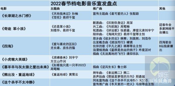 回顾去年同期,2021年春节档电影令人印象深刻的主要推广曲包括刘德华和肖央为电影《人潮汹涌》演唱的《新的一年》、贾玲沈腾张小斐为《你好,李焕英》演绎的《路灯下的小姑娘》等等。可以说今年的电影宣传推广曲从数量到概念都要更胜一筹。