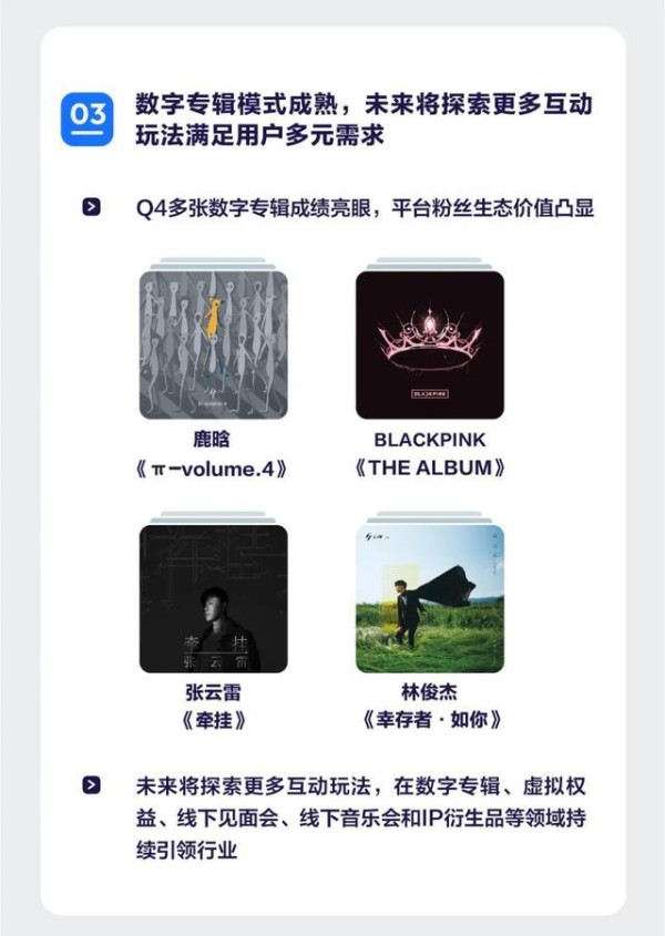 作为中国数字专辑模式的开创者与引领者,TME以粉丝经济为核心对该模式持续进行升级创新。在第四季度发行了多张数字专辑,其中包括:鹿晗的《π-volume.4》、BLACKPINK的《THE ALBUM》、张云雷的《牵挂》。林俊杰第14张专辑《幸存者·如你》在发行首日冲顶多个音乐榜单。
