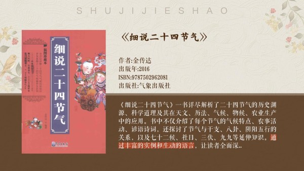 《细说二十四节气》中介绍到, 二十四节气是中国古代农耕文化的产物,每个节气都蕴含了深刻的科学道理和自然规律。这些节气不仅指导着农业生产,还反映了自然界的气候变化和生物节律。立春、春分、立夏、夏至、立秋、秋分、立冬、冬至,这八个节气是反映季节的,用来划分一年四季,体现了中国古人对自然界的细致观察和深刻理解。除此之外,还有反映气温、降雨、露、霜等气候情况的节气,如小暑、大暑、处暑、小寒、大寒等,它们揭示了天气炎热和寒冷的时间及过程;而白露、寒露、霜降则描绘了天气转凉和空气中水汽的不同凝结状况。同时,还有预示降水时间和程度的节气,如雨水、谷雨、小雪、大雪;以及反映物候现象和农事活动的节气,如惊蛰、清明关于自然现象,小满、芒种则与作物的生长发育相关。这些节气名称生动形象,不仅描绘出一幅幅冷暖干湿变化的自然画卷,还展现了一幕幕记录生产和生活的独特场景,充分体现了中国古代人民的智慧和观察力。