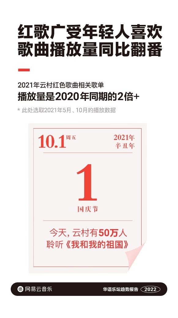 红歌广受年轻人喜欢的趋势越来越凸显。2021年5月和10月,网易云音乐平台红色歌曲相关歌单总播放量是20年同期的2倍多。2021年10月1日,超50万人在云村聆听《我和我的祖国》。年轻音乐人创作的优秀正能量歌曲,同样受到越来越多的欢迎,《五四特别版错位时空》乐评过万,《红色》乐评超6万。