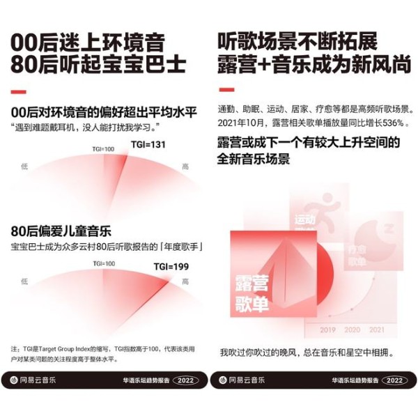 关于听歌场景的拓展趋势,报告指出,露营或将成为下一个有较大上升空间的新音乐场景。“露营+听歌”成为不少年轻人的新生活方式。2021年10月,网易云音乐上露营歌单播放量较去年同期增长536%。