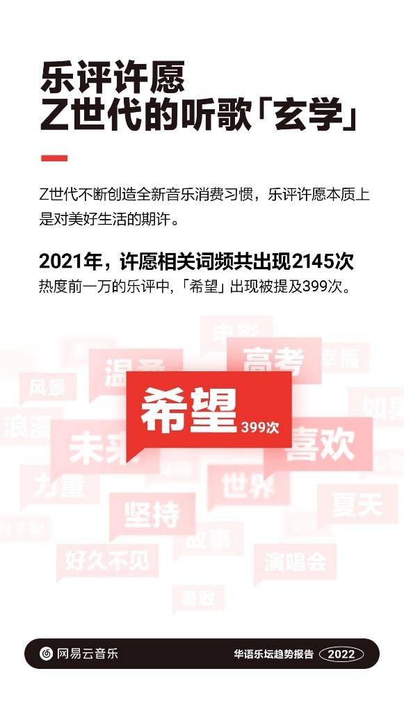 网易云音乐的社区UGC内容也出现新变化。报告发现,Z世代正在创造全新的“乐评许愿”等音乐消费习惯。2021年,网易云音乐热度前一万的乐评中,“希望”被提及399次,高居第一。“听歌许愿”,本质上体现的是对美好生活的期许与祝福。网易云音乐用户的许愿,既包含对自己、家人、恋人和朋友的真诚祝愿,也包含对陌生人的善意祝福。