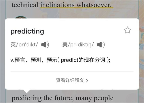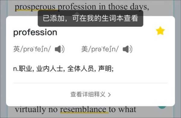 加入单词本: 遇到陌生的单词,可以点击星号一键加入生词本。想复习生词,点击左上角的菜单栏,进入我的生词本,即可快速查看。