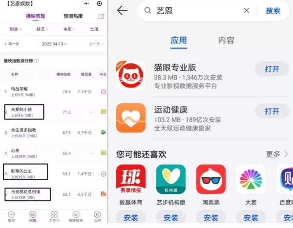 但需要注意的是,艺恩的数据系统有待改进。以网播数据为例,不论是正在热播的《亲爱的小孩》,还是已经完结的《影帝的公主》,在艺恩小程序里显示的集数都是零。如此明显的错误在无形中降低了用户对平台的信任指数。此外,其研发的“艺恩APP”也在个别应用商店(如华为手机端)中消失。